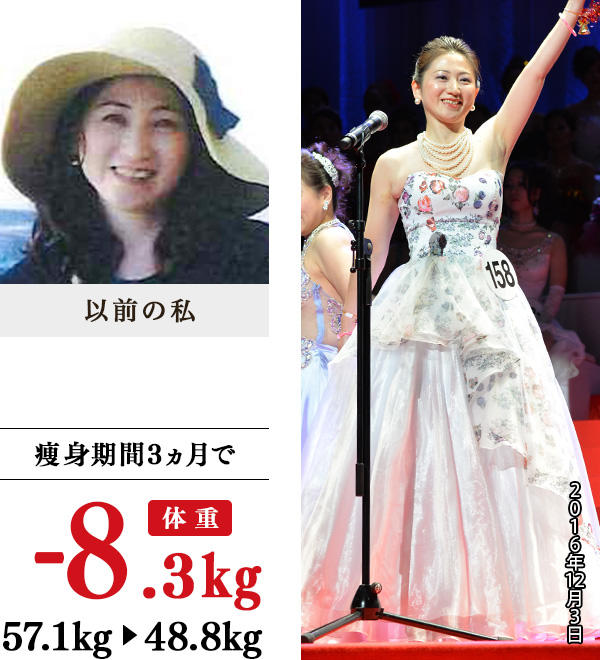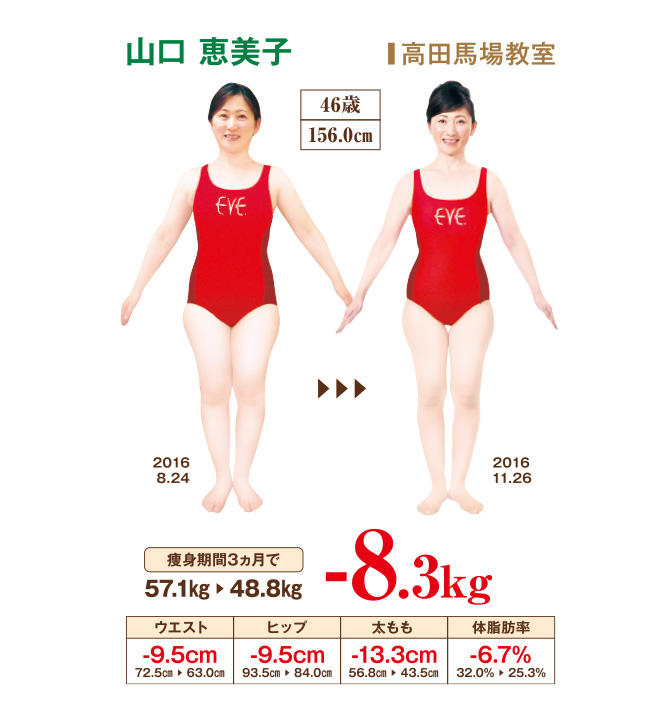 下半身太りが40歳過ぎから加速し、そのうえ背中や二の腕にまで肉がつき、気づけば臨月時の体重に…。主人からも、「昔は痩せていたのに」の言葉。このままではマズいと思い、イヴの門をたたきました。温かい教室で受ける痩身技術はハードでしたが、代謝をあげるためなのだと実感。先生たちは熱心に指導してくださり、食事面では麺類を控え、食パンをライ麦や全粒粉などのパンに代え、3食きちんと食べ、白湯も飲むようになりました。ホームケアのブラッシング体操は入浴前に実行。痩せやすい体づくりをしながら体重を落とすという自己流ではできない痩身法で、30代の体重に戻り、太もももサイズダウンしたので、パンツが履けるようになりました。