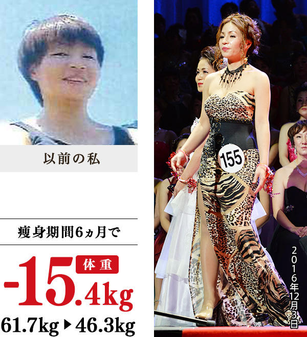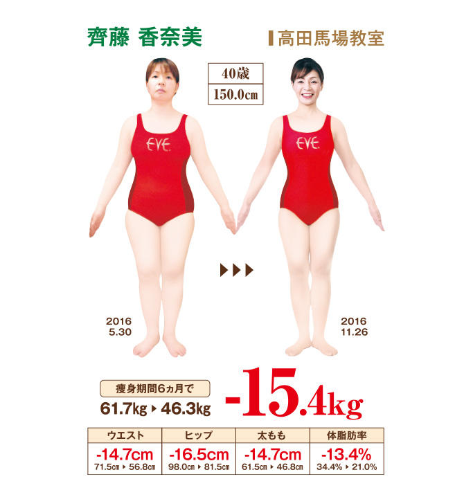 20〜30代のときにエステに通ったり、自己流ダイエットをしたけれども、目標体重は達成できず…。彼の、「デブはみっともない」という言葉で、イヴを訪ねました。体を温める温式痩身は、冷え性の私にはとてもあっていて、体験1回で3kg痩せたので、すぐに入学。減量とともに、ボディラインが整うことも実感できました。自宅では、ドカ食いをやめ、ホームケアのブラッシング体操は半身浴前に実行し、6時間以上の睡眠もキープ。通学5回で5kg痩せた頃から顔がスッキリして、目が大きくなり、28回で10kg減量後にはタイトスカートが格好よく履けました。彼には、「華奢になった」といわれ、ずっと魅力的だと感じていた鎖骨美人にもなれました。