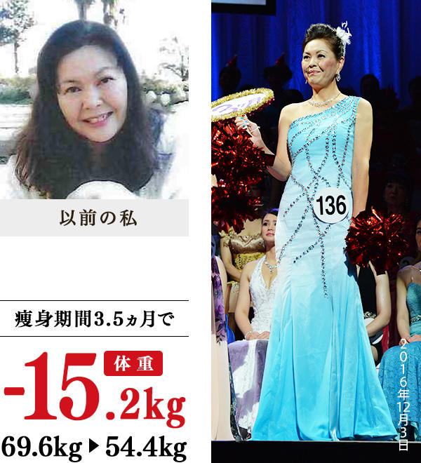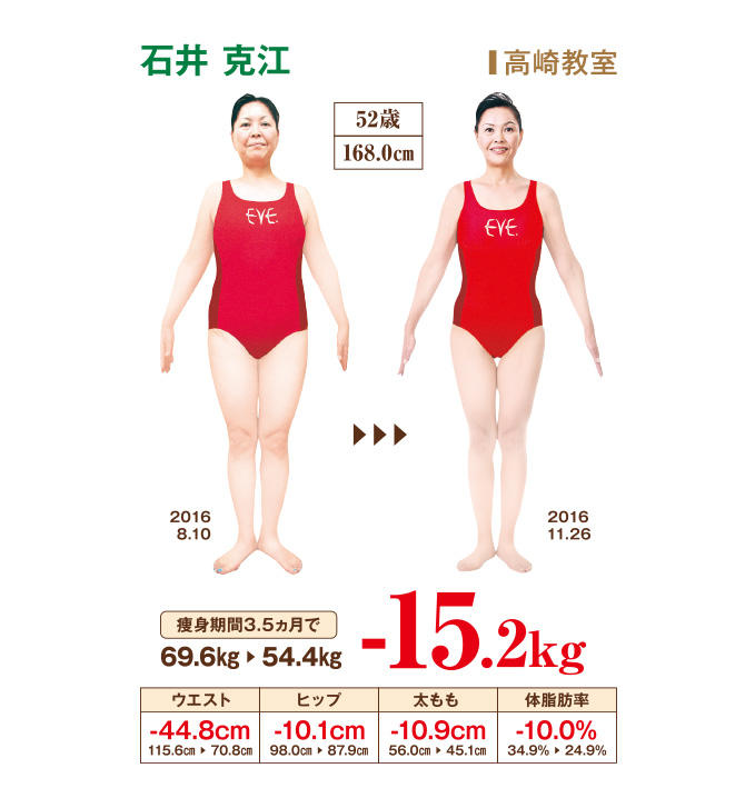 健康診断で、「軽度の脂質代謝異常、重度の脂肪肝があるので、痩せる努力をしてください」と医師から指導されたため、イヴに入学しました。最初は、暑い教室にいると倒れそうな気がしましたが、暑い中でボディケアするからこそ、逆に成果が出るのだと実感。経絡を流す手技はとくに気持ちよく、リラクセーション効果も抜群なのに痩せられました。自宅では、先生たちに勧められた食事、体操、入浴法、健康補助食品をすべて実行したら、教室で落とした体重が維持でき、6回で−5kg、14回で−10kg、23回で−15kg!入学のきっかけの脂肪肝が正常になり、肩こりも軽減しました。会社の同僚が、「たるみなくキレイに痩せたイヴってすごい」と驚いています。